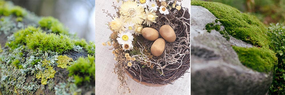 For purchase, I buy my moss from an online retailer that specifies that their mosses are sustainably harvested and undyed. Because I use so much, I can save money and buy it in bulk. Different types of mosses are also available from craft stores--look for a "natural" moss if you want to avoid dyes. If it's bright green, it is dyed! Most packaged mosses are chemically preserved; this will likely be a glycerine-based preservative, which is non-toxic. Below you can see what moss looks like growing in nature, and then in the center, how the dried form can be used in crafting: