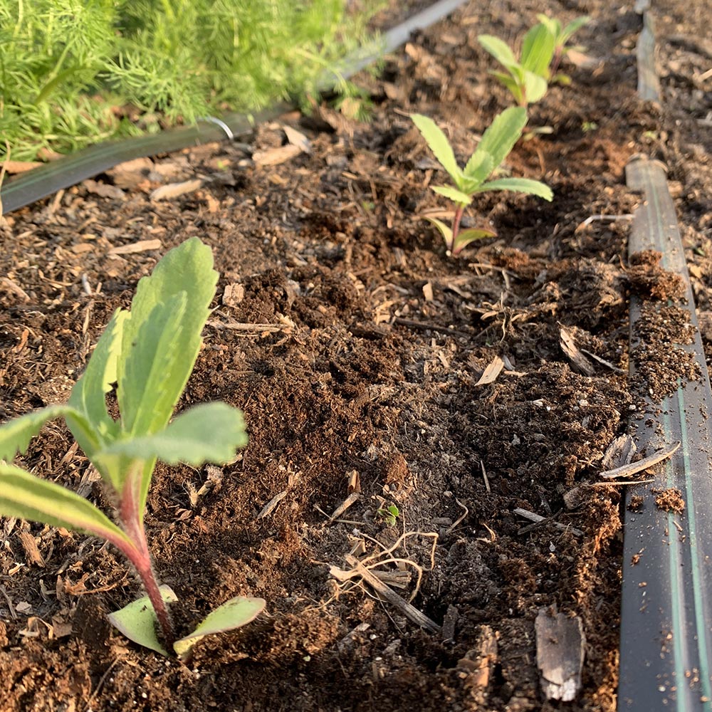 I have been working hard at preparing the beds...pulling straIy weeds, adding organic fertilizer, laying drip line. The Paper Moon seedling...along with its "siblings"...will make their home next to a row of Bupleurum that was planted in the fall and overwintered--so it got a bit of a head start.