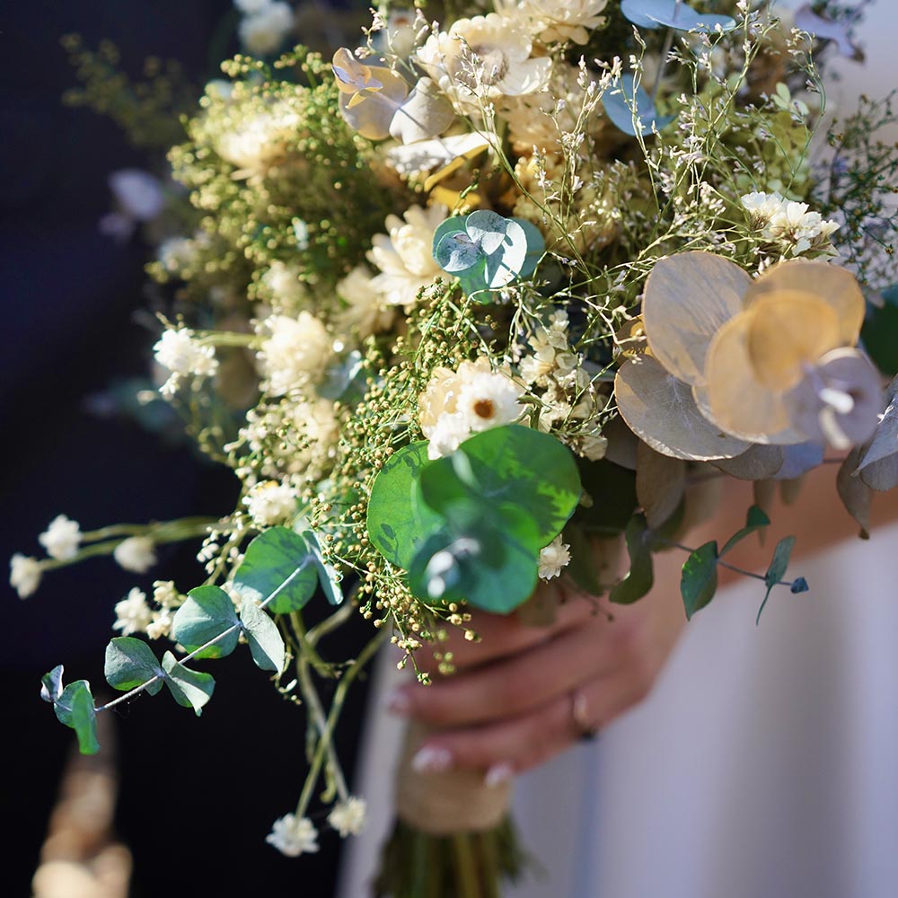Remember those supermarket and florist bouquets I just mentioned that are potentially doused with lots of toxic pesticides? And all the other synthetic craft supplies? When we are done with them, they end up in our landfills...and then in our water. So, when we take better care of ourselves, we also do a bit to keep our world cleaner. I am not trying to guilt-trip you--trust me! If you came to my house today you would still see plastic packaging and non-organic food and plenty of other things on the "naughty" list! I do what I can do, taking into account my time, my finances and availability. When I sit down to design a craft for my business, however, I FEEL SO GOOD pulling down a sweet little bundle of dried flowers and tying it with twine, knowing that it will last a long time, bring beauty to my customers' homes, and when it is someday thrown away, it will not sit in a landfill but nourish the earth that it came from. It seems like just a little thing, but perhaps enough "little things" will make a big difference. I made the below bridal bouquet from my farm-grown and dried florals--clean flowers for a happy day!