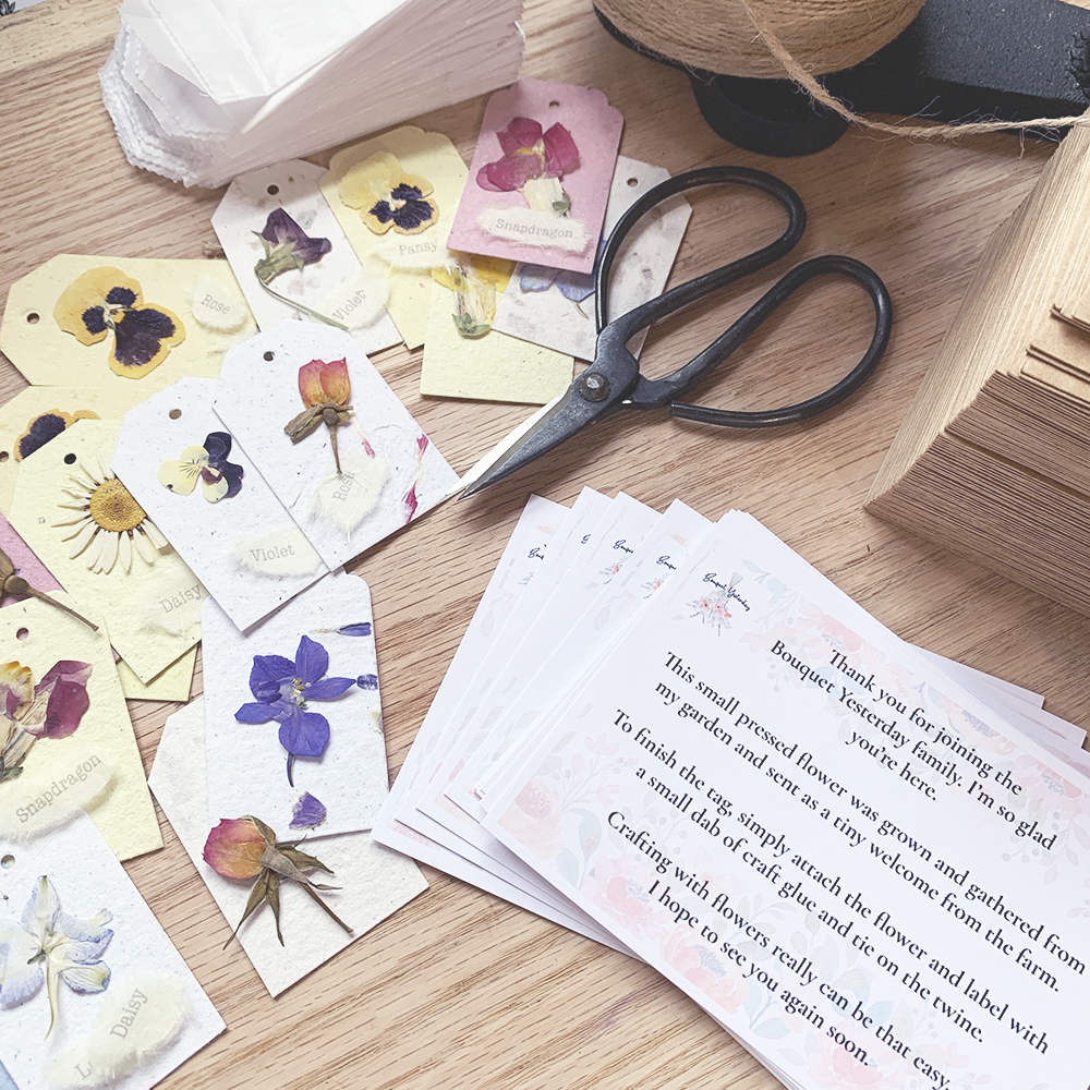 My ideas bloomed into a very unusual but exciting endeavor...the next 100 subscribers to my e-mail list will receive a little "kit" to make their own pressed flower gift tag. A handmade paper tag, one pressed bloom, an herbarium-style flower label on mulberry paper and a length of twine for tying it to whatever they please. Packaged in a glassine envelope and tucked into a kraft envelope with a note, it feels like ME. It feels like my farm. I hope it will be a sweet introduction to Bouquet Yesterday for many.