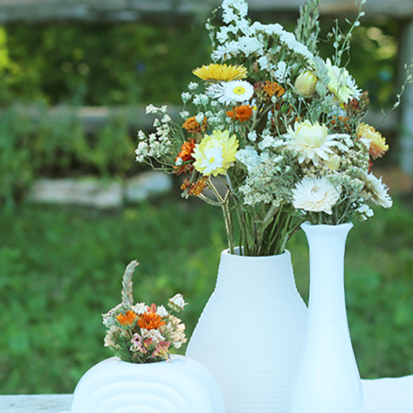 1) Figure out how you will display it! Since dried florals do not need water, you can choose a pretty vase, an antique jug, a coffee mug, bucket, basket...just about anything...to tuck it into! My bouquets also look so cute just unwrapped and placed on a shelf or mantle! When you unwrap the bouquet, you will see that the stems are held together with an elastic band. You can either leave the band on, or take it off--it all depends on the size of the container you are using. Feel free to trim the ends with kitchen scissors or garden snips to accommodate your container.
