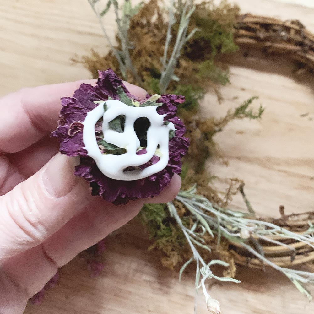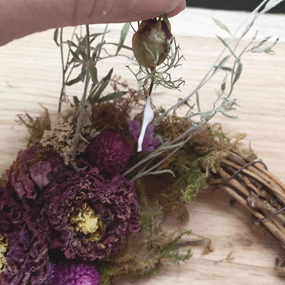 4) Don't worry if the wreath drops a few flowers now and then. Simply shake it off and move on! If a large portion becomes loose, you can reattach it with the same type of glue you used to put them on.
