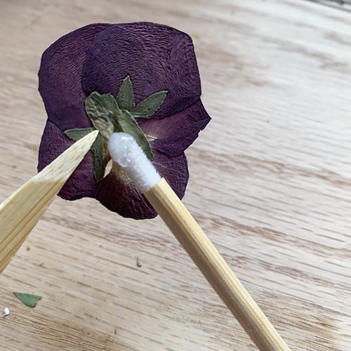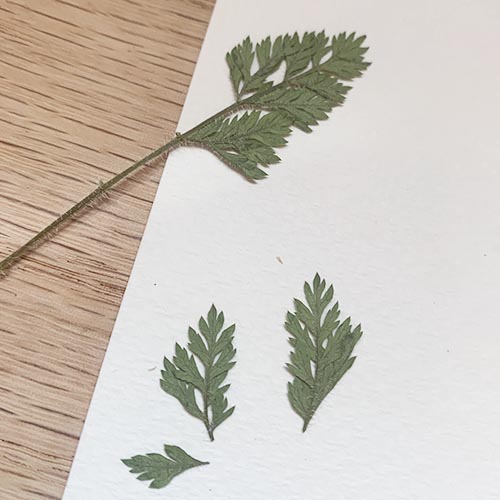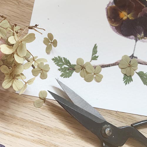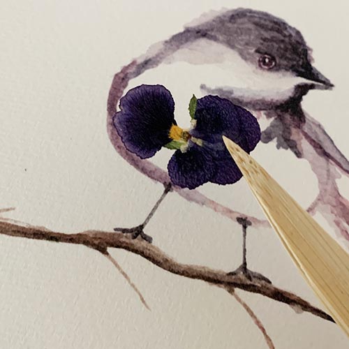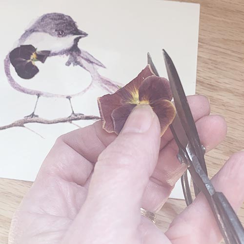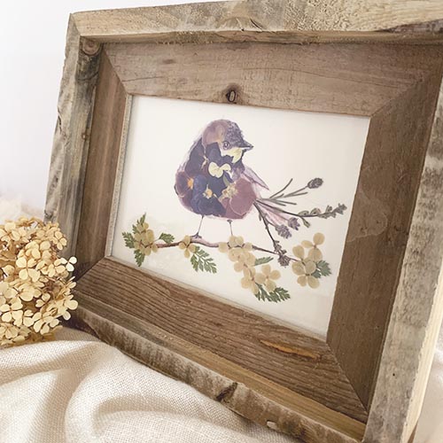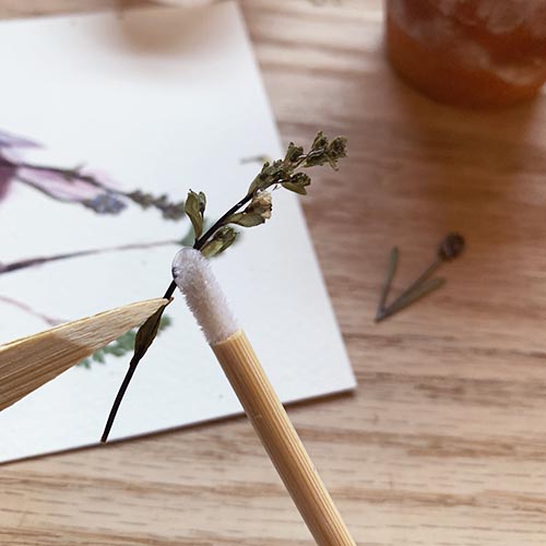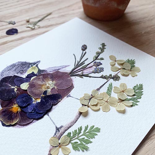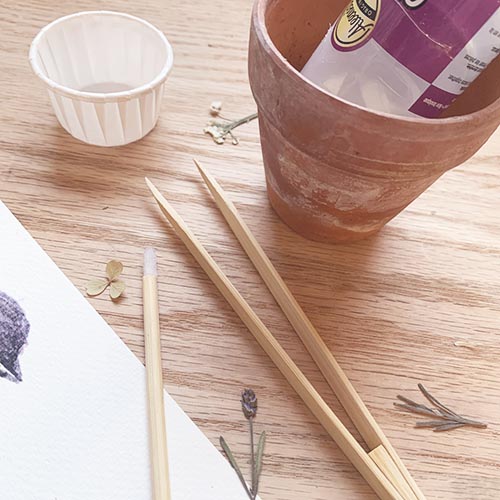 To begin your project, assemble your materials...your kit, which includes your sparrow watercolor print, bamboo tweezers, glue applicator and pressed flower packet. You will need some basic craft glue. I like to keep my bottle of glue upside-down in a pot or cup while working to keep the glue at the tip. A small paper cup is also handy to keep glue accessible.